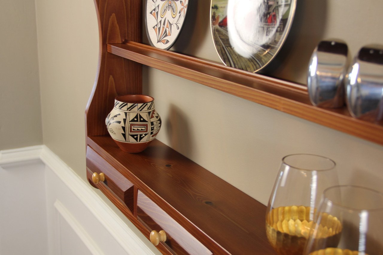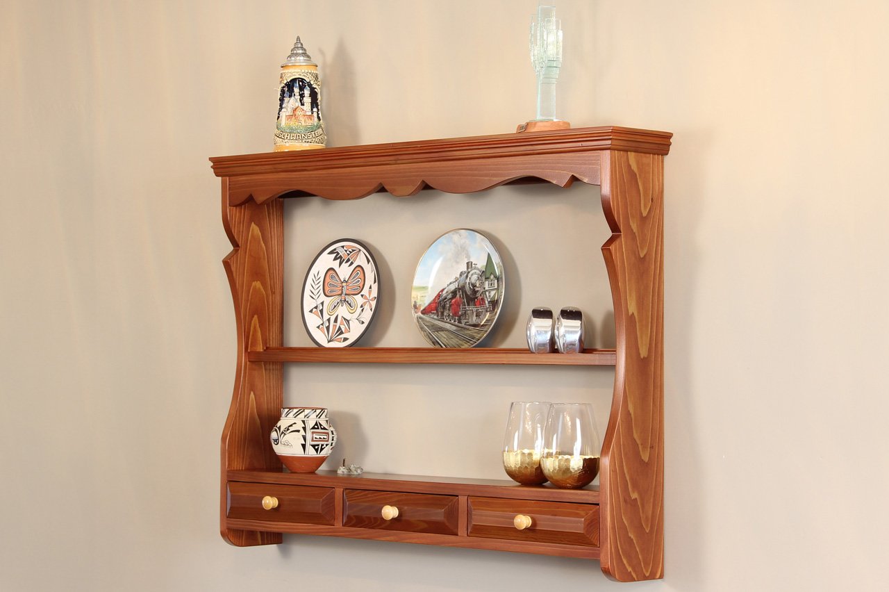Plate/Curio Shelf — $329This early american plate shelf is constructed from western cedar, and is stained with an oil based finish. Topcoat is a satin lacquer. Notice three drawers with solid cedar & natural finish on the interior.